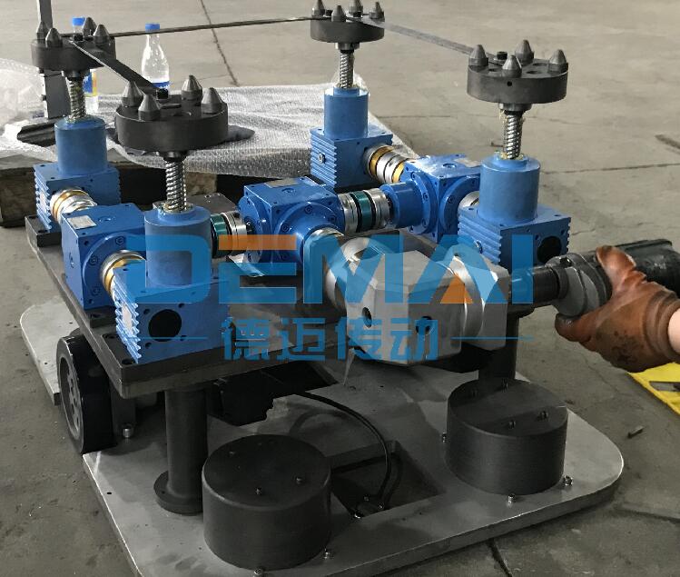 滾珠絲桿升降機同樣可以多臺聯(lián)動使用,今天我們就四臺聯(lián)動的方案和大家講一下滾珠絲桿升降機搭配伺服電機的優(yōu)勢。讓廣大機械工程師對于方案的設(shè)計有更多的思路和想法。 如圖所示,整個方案采用的是四臺滾珠絲桿升降機聯(lián)動,升降機采用絲桿運動形式,并且頭部配有法蘭接盤。升降機通過聯(lián)軸器和轉(zhuǎn)向箱連接在一起。為了保證升降機與轉(zhuǎn)向箱在同一水平線上,我們使用了升降機加裝安裝板來實現(xiàn)。由于客戶對于精度有著極高的要求,我公司生產(chǎn)的升降機精度就很高,再加上我們在驅(qū)動源的選擇上,為其選了精度更高的伺服電機,以及精密行星減速機,這樣整套方案的精度可到0.05mm之內(nèi),讓客戶非常滿意。